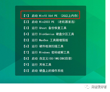 3、进入主菜单后,通过“”键选择“【1】启动Win10 X64PE(2G以上内存)”后回车确认