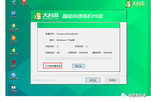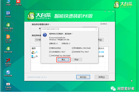 6、Win7系统安装完成后点击“是”重启电脑并拔掉U盘(以免重启时再次进入大白菜PE界面)