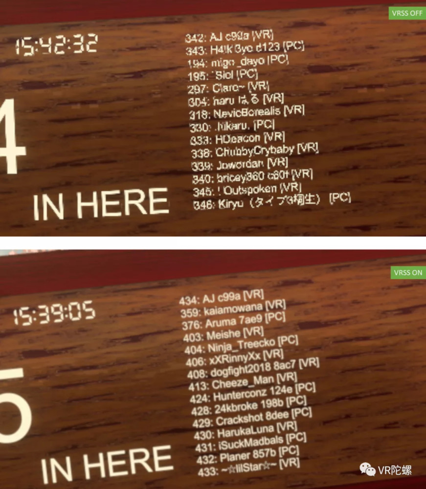 VRChat中同一场景比较显示,启动基于Tobii眼动追踪的Nvidia VRSS2可以得到更加清晰的图像画面。上图为未开启注视点渲染,下图为开启状态
