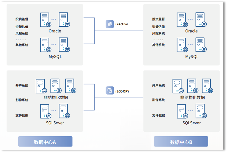 对于非结构化的数据,通过英方 i2COOPY 实时复制软件,实时捕获字节级增量并实时传输到灾备服务器。i2COOPY 在窄带、远距离、大数据量等各种复杂环境下均有优异的表现,其效率远高于传统的数据传输方式,且支持 Windows 和 Linux 平台下的几乎全部应用,包括法人清算、风险、成交回报、影像、邮件、OA、报盘、用友、CRM 等各类证券业务。