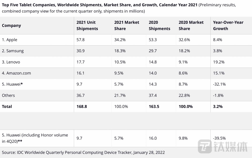 IDC:2021全年平板电脑出货统计