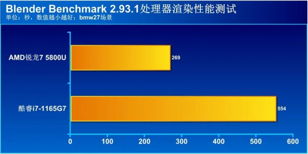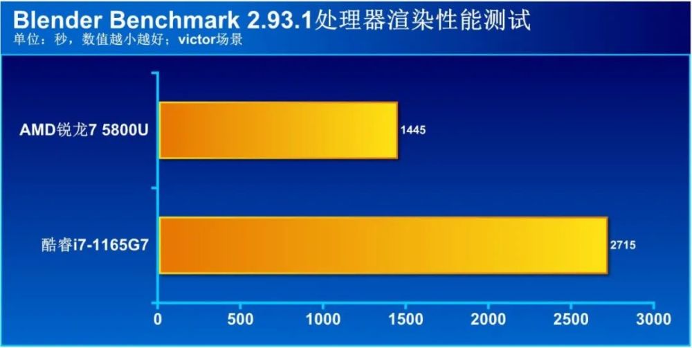 Blender是一款免费开源三维图形图像软件,提供从建模、动画、材质、渲染、到音频处理、视频剪辑等一系列动画短片制作解决方案。在耗时最短的bmw27渲染场景中,搭载AMD锐龙7 5800U的商用本仅耗时4分钟29秒就完成了任务,而搭载酷睿i7-1165G7的商用本耗费了9分钟14秒。如果把时间拉长一点,在长时间的渲染工作下,锐龙本完成victor场景的渲染任务耗时24分钟5秒,而酷睿本的时间线来到了45分钟15秒。显然这项测试中锐龙处理器有着碾压性的优势。