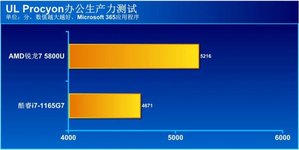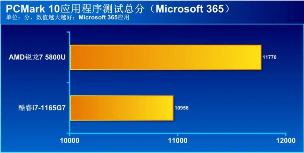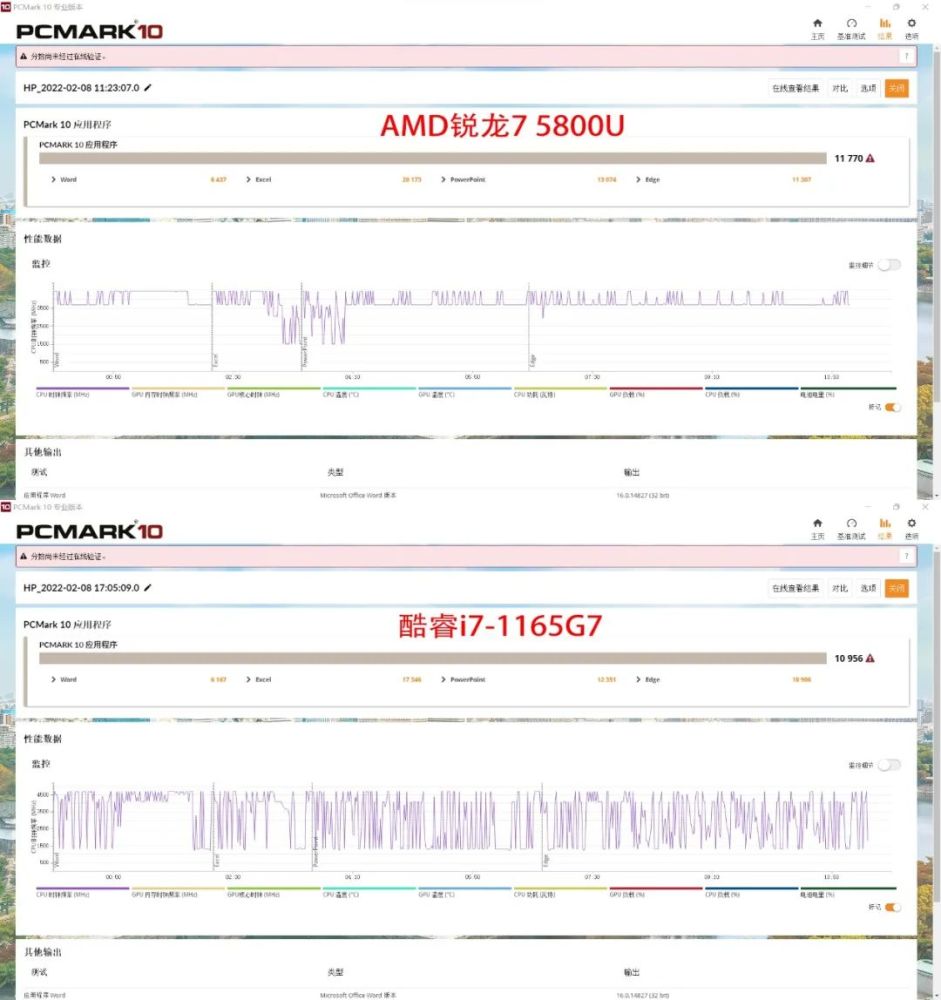 可以看到,当两台轻薄本的屏幕尺寸、机身尺寸、内存、SSD、散热、电源模式等完全一致时,仅处理器的不同也会在office应用办公层面带来不小的差异,也就是说处理器的性能对轻薄本的office应用办公表现有很大的影响。在UL Procyon办公室生产力基准测试和PCMark 10应用程序测试中,锐龙版机型(搭载AMD锐龙7 5800U)全面领先酷睿版机型(搭载酷睿i7-1165G7),领先幅度分别为11.6%和7.4%。