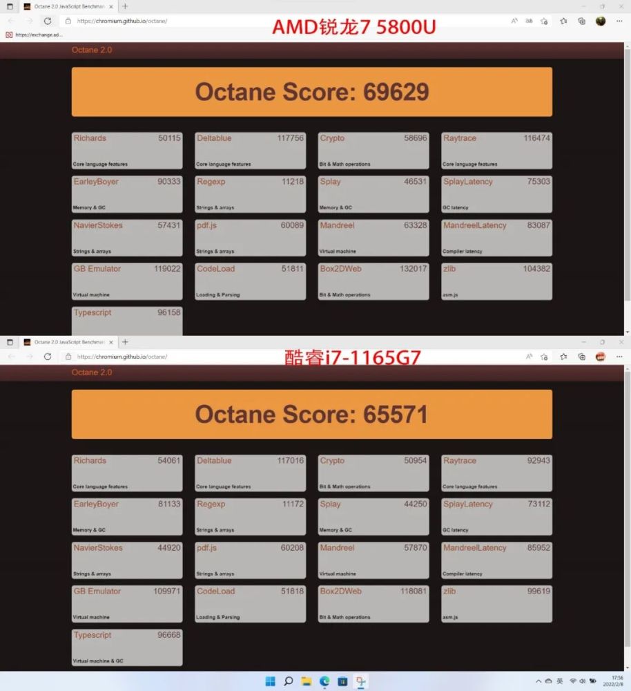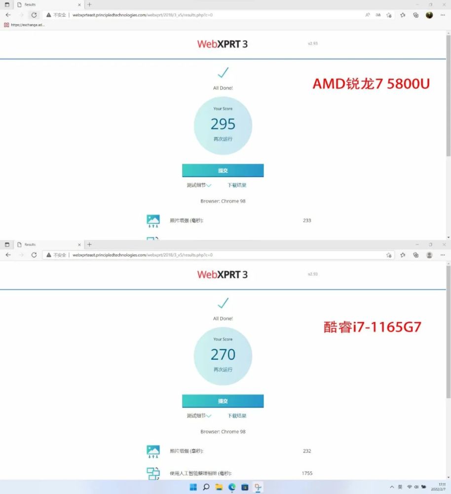 可以看到,在web网页浏览综合性能测试中,即便两款机器的其他配置都一样,但是处理器的差异依然会为网页浏览性能带来一些影响。在两项网页浏览测试中,锐龙版的轻薄本都领先酷睿版的机型,领先幅度分别是9%和6%。