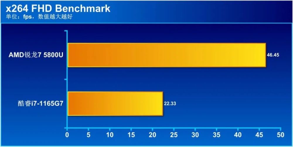 最后再来看一下V-RAY处理器渲染性能测试和x264 FHD Benchmark测试的成绩。在这两个测试中,搭载AMD锐龙7 5800U的商用本也有很大的优势,领先搭载酷睿i7-1165G7的商用本大约100%。