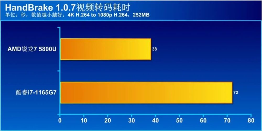 首先,HandBrake是一款知名的视频编码软件,它可以用于视频编码 (转码)、添加字幕和音频、反隔行、去除噪点等,深受内容创作者(自媒体)、电影制作人、各类广播公司的喜爱。在这个测试中,我们将一段252MB的4K企业宣传片转码为1080p视频,锐龙本仅耗时38秒,而酷睿本需要多达72秒,可见锐龙本在这里明显有着更高的效率。