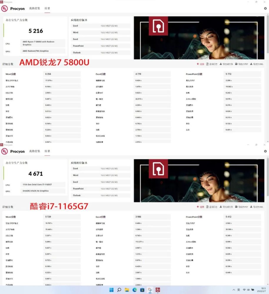 如果细分来看,会发现锐龙本在UL Procyon测试中的成绩更出色,它的“Word分数”“Excel分数”“PPT分数”都领先酷睿机型,比如在Word测试中导出PDF的时间比酷睿机型更短,在Excel中解方程的耗时也比酷睿机型短。也就是说AMD锐龙7 5800U处理器的众多领先特性(比如更多的线程数量、更先进的7nm工艺等)确实在实际办公应用中更有优势。