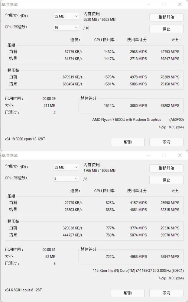 压缩和解压缩类软件在大多数笔记本中都是不起眼的工具类应用,但是日常办公却离不开它们,不管从事什么工作,我们都时常需要解压或者压缩文件、资料,对于一些办公业务繁重的岗位(比如文秘、新媒体编辑、创意设计等)来说,解压几十GB的压缩包可能更是常态。因此我们通过7-Zip软件来看看两台机器在压缩和解压缩方面的表现。
