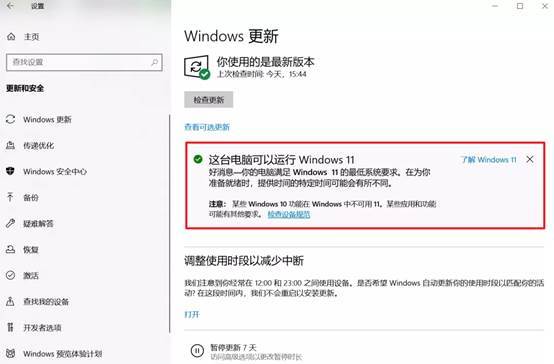 打开【设置】―【更新和安全】―【windows更新】,符合升级条件的PC设备在Windows Update 中会有明确的提醒。