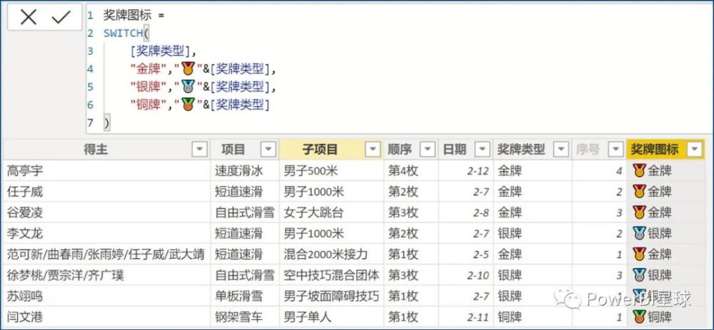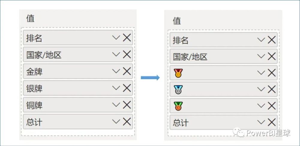 回到上面冬奥会奖牌榜的例子,只需要双击表格【值】中的字段,删掉原来的字段名称,替换为表情符号中的金牌等图标就行了: