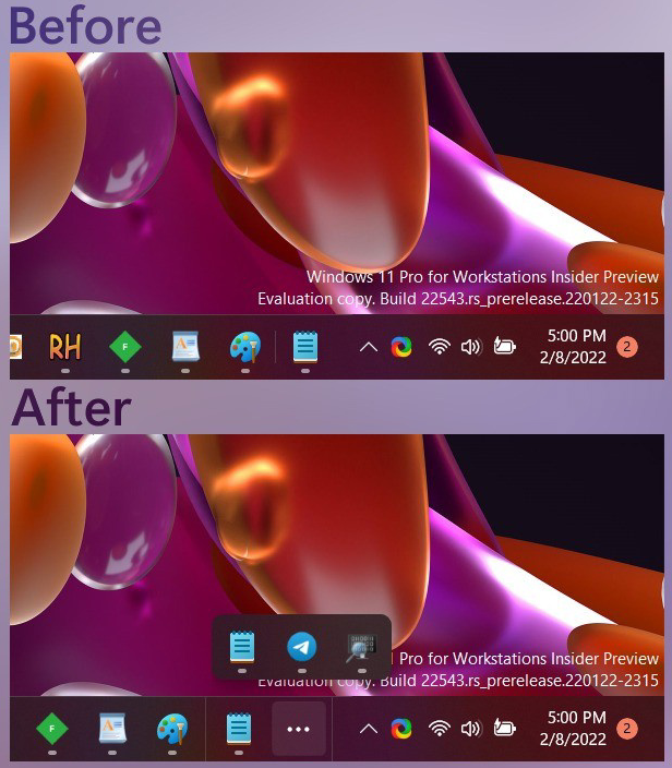从曝光的内容来看,微软正在开发一个新的 "溢出菜单",当你状态栏中填满了运行中的应用程序时,它将帮助你更快捷地找到某个程序,并允许用户轻松调整任务栏的大小。