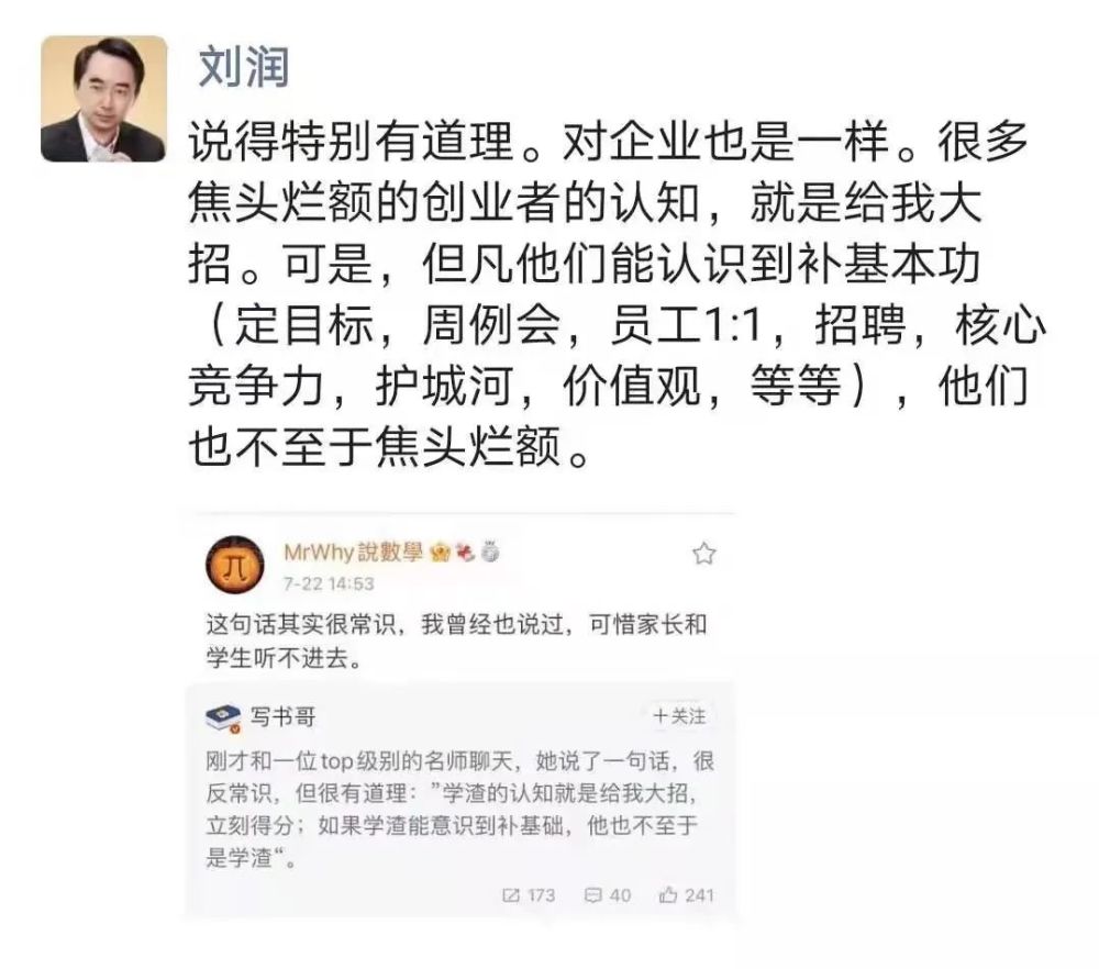 说得特别有道理。对企业也是一样。很多焦头烂额的创业者的认知,就是给我大招。可是,但凡他们能认识到补基本功(定目标,周例会,员工1:1,招聘,核心竞争力,护城河,价值观,等等),他们也不至于焦头烂额。