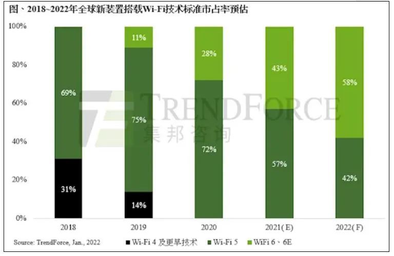在产业报告中,调研机构TrendForce集邦指出,虽然当下WiFi 5(802.11ac)还是主流,WiFi 6/6E(802.11ax)还在推广,但综合考虑技术特性、成熟度、产业现状等,预期2022年WiFi 6、6E将超越WiFi 5成为主流技术,全球市占率有望达58%。