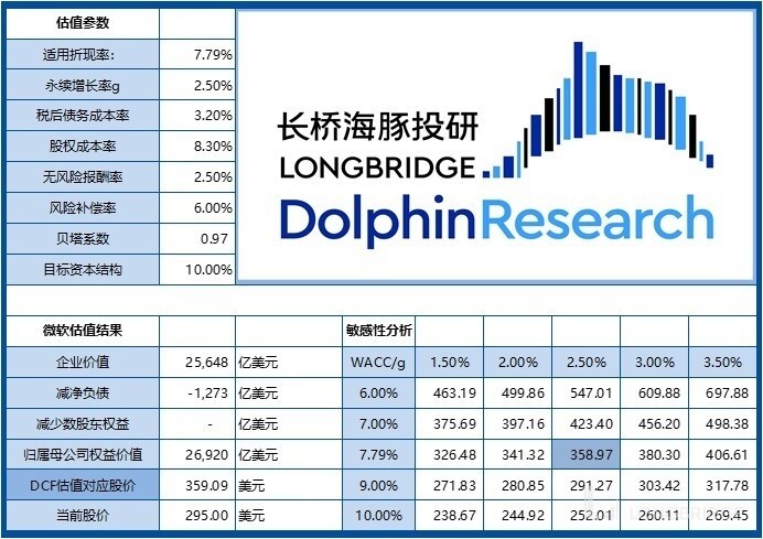 考虑到近期市场对长债收益率的变化,对 WACC 的收益率比较敏感,不妨留意一下不同折现率下的估值区间,海豚君认为即使 Beta 导致大盘的下挫,微软也会提供更确定的安全边际。