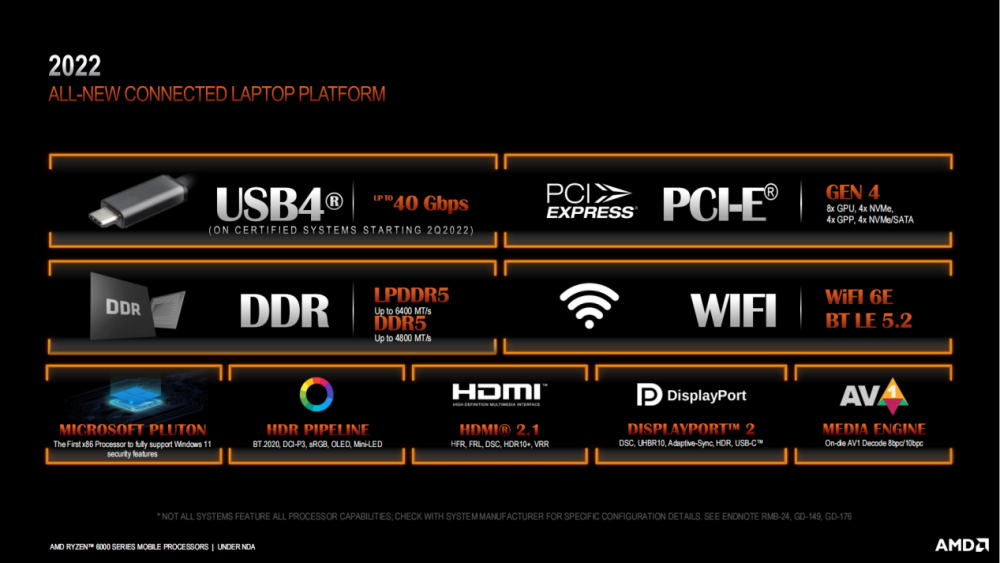锐龙 5000 系列移动处理器一大遗憾就是 USB4、PCIe 4.0 等外部接口的缺失,而锐龙 6000 系列移动处理器终于补足了这些遗憾。不仅支持 USB4、PCIe 4.0 等外部拓展接口,还全面支持了 DDR5 内存、Wi-Fi 6E 等新技术为新世代的到来做足了准备。