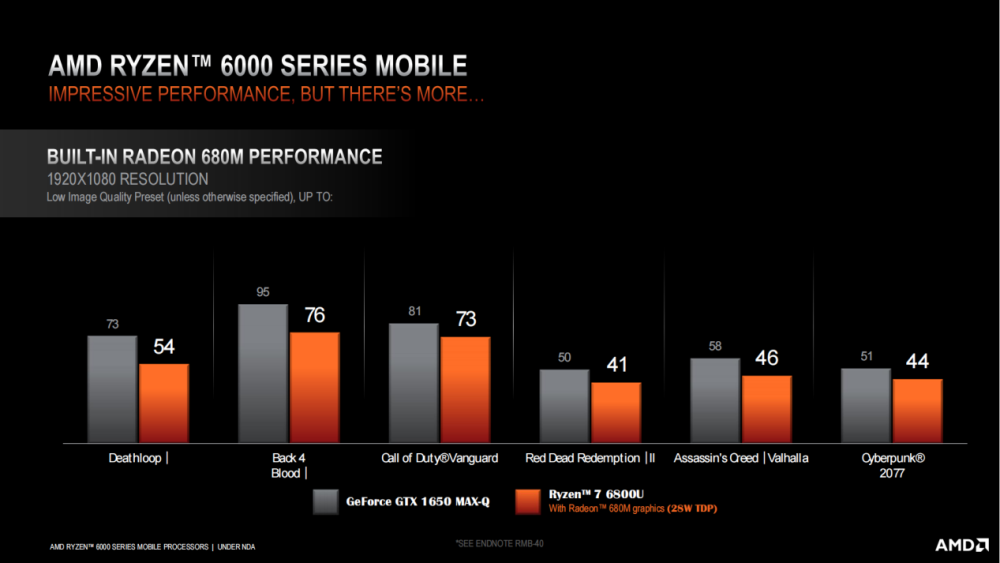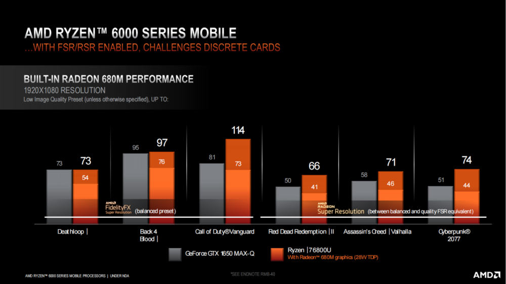 那么,采用全新 RDNA2 架构的内置显卡大概相当于什么水平的独立显卡?相信大家也是非常好奇的。从 AMD 放出的对比图可以看出,锐龙 7 6800U 上的内置显卡物理性能要比 1650 Max-Q 独显低 15% 左右,大概相当于 1050 独显的水平。别忘了,这只是一枚轻薄本上的低压处理器,就已经能达成几年前游戏本的性能水平了,畅玩主流网游已经不在话下。在 2022 年,对于大部分用户来说,一台轻薄全能本就已经能满足需求了。