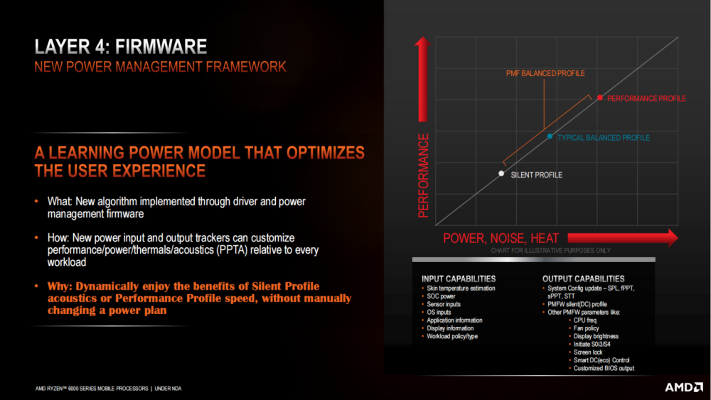 除了硬件上的设计外,AMD 还从固件和软件层面协同优化功耗,比如利用 PMF (platform management framework 功耗管理框架) 技术对用户行为和系统工作进行感知,然后自动调整性能预设,比如检测到游戏负载的时候就提供更高性能,检测到轻度办公的时候就提供续航和静谧。