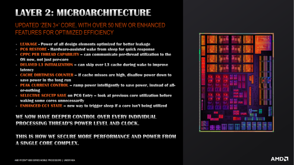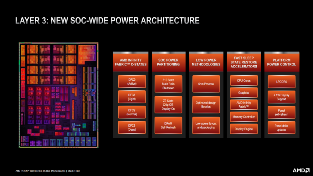 不仅仅有微架构上的改进,AMD 还在 SOC 上应用了全新的电源功耗管理架构。比如目前一些 SOC 可以实现独立开关、独立功耗控制。此外 AMD Infinity Fabric C-States 也应用在了锐龙 6000 系列上。通过这一状态,在需要节约功耗时,可以在保持系统、RAM、显示和核心开启的前提下,单独关闭数据总线。以上这些单独开关独立控制的设计,都是为了降低在低负载状态下非核心功耗对续航的影响。