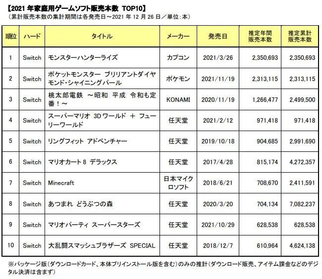 在御三家中,任天堂反而成为了独自安好的一位。从市场竞争层面来看,任天堂与微软、索尼的游戏业务虽然都是主机市场,但业务范围并不重叠,前者在掌机市场已经完成了绝对的垄断,尤其是在日本――据fami通最新的报告指出,日本主机游戏销量TOP 10中,任天堂的产品又一次完成了全面霸榜,并且switch主机的销量也远远超过次世代主机PS5、XSX/XSS。