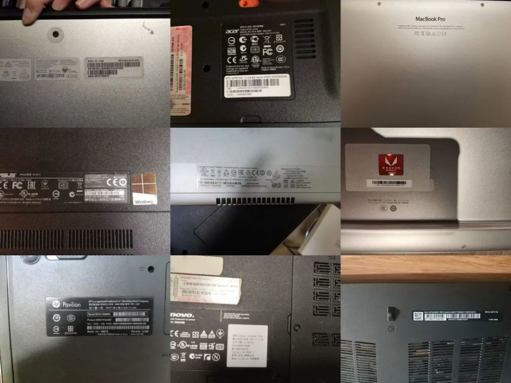 购机时首先要确认笔记本的型号,如果电脑的 B 面(屏幕面)边框没有标注具体型号,一般在 D 面(就是底面)就可以找到包含相应信息的标签或刻印。