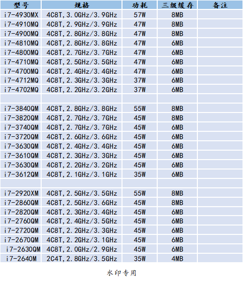 这次换装的处理器是 i7-4702MQ(4C8T,2.2GHz-3.2GHz,37W),用来替换原有的 i5-4200M 是最合适不过的了。在第六节性能释放中笔者对可更换的 CPU 进行了参数盘点,有相关需求的人员可以参考表格选择对应的 CPU 进行升级。
