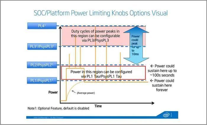 相比温度墙是厂商可以自行设定的,功耗墙是 CPU 本身的固有设置,CPU 的功耗上限其实并不是 TDP。以 Intel 的 CPU 为例,其为 SoC 定义了 PL1-4 共计四级功率档位。