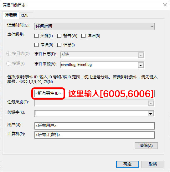 接下来,在【任务类别】上方“所有事件ID”的位置输入6005和6006这两个ID,中间用英文状态的逗号隔开,最后点击确定。其中,6005代表Windows系统的开机日志,而6006则代表着Windows系统的关机日志。