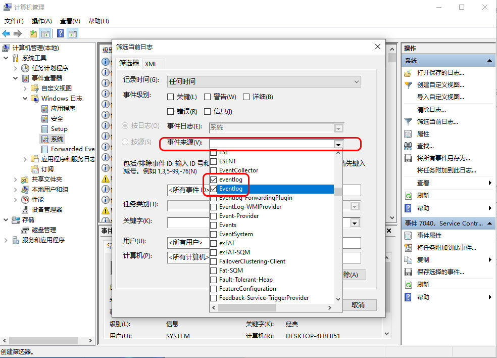 然后在【事件来源】的下拉菜单中选择【Eventlog】对系统日志的类型进行过滤。
