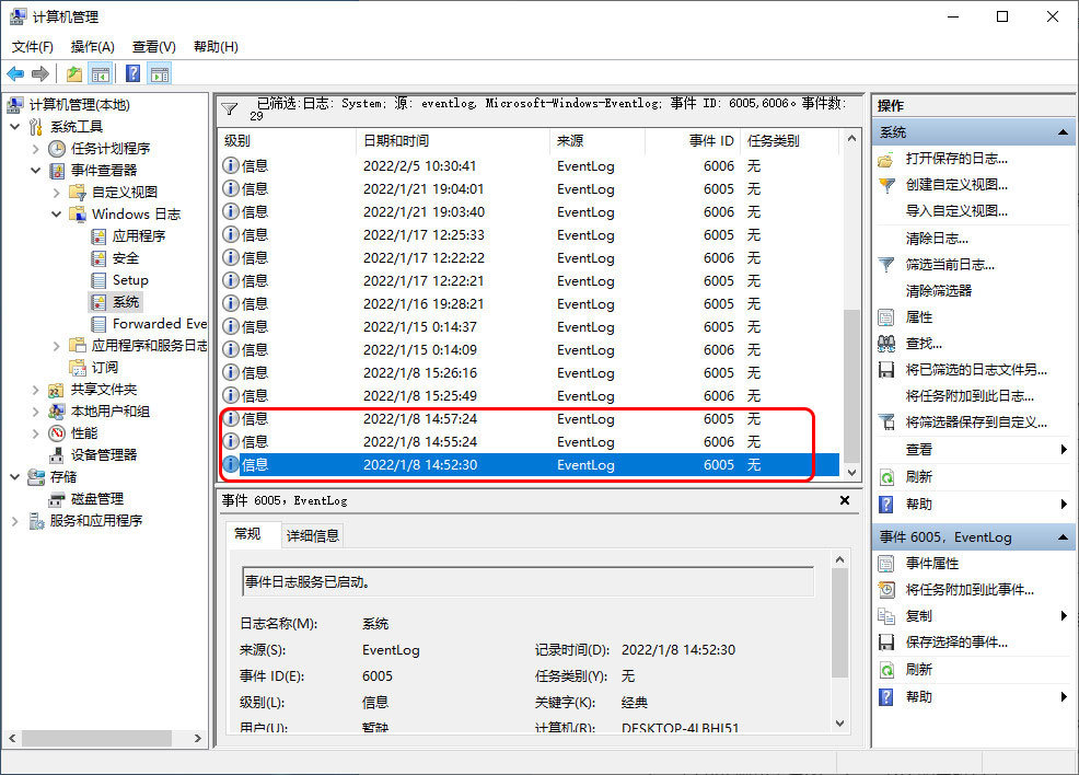 从筛选出来的众多日志列表中下拉到最底部,就可以看到该电脑的第一次开机时间了。然后将这个时间和电脑的出厂时间做一个对比,就可以判断这台电脑是不是二手电脑或者翻新机。