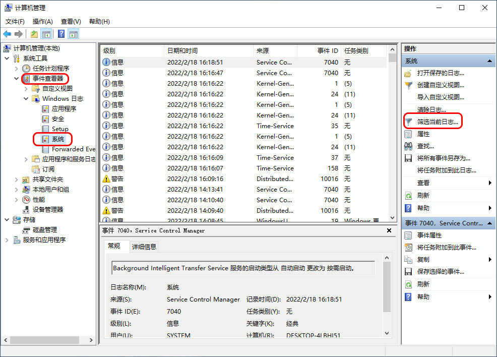 从界面的右侧功能中选择【筛选当前日志】打开系统日志筛选器。