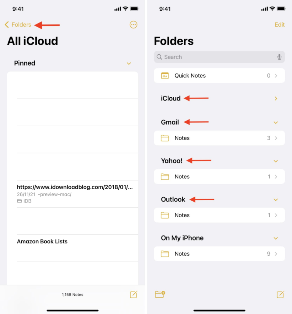添加首选帐户后,打开备忘录应用程序并点击文件夹以查看你可以在 iOS 备忘录应用程序中创建备忘录的所有可能位置。