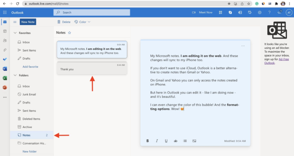您可以通过登录 outlook.live.com > Notes 来访问和编辑保存在 Web 上 iPhone 备忘录应用程序的 Outlook 文件夹中的备忘录。在网络上所做的所有编辑都会同步到你的 iPhone。