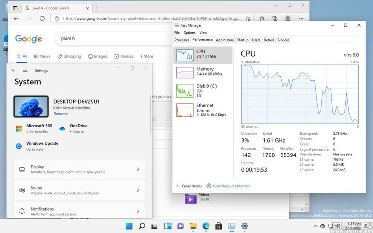 没错,熟悉PC的朋友想必已经看出来,这是微软Windows 11的界面。事实上,这个截图也确实来自一台Pixel 6,更准确地说,是来自一台运行在Android 13系统内部的Windows 11虚拟机。