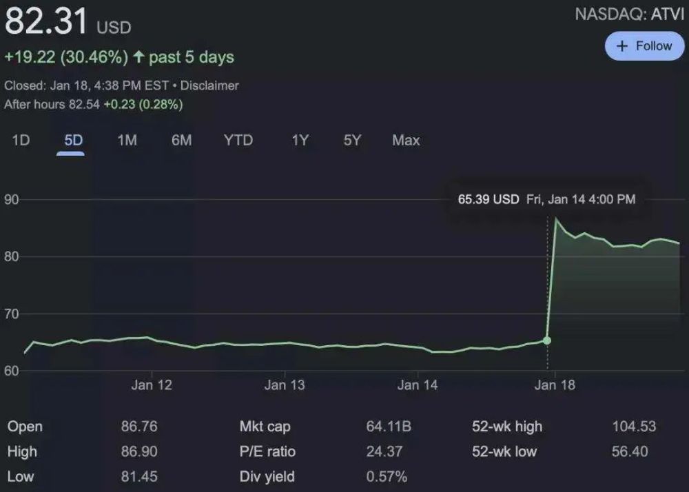 受收购消息影响,动视暴雪股价盘前一度大涨将近40%,目前收盘价较前一交易日上涨近26%,收于每股82.31美元。