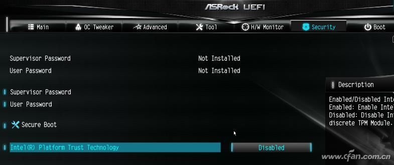 开机时按Del键进入BIOS。Intel平台要进入Security安全选项,找到Intel(R) Platform Trust Technology项,可选择Disable或Enabled。AMD平台要进入Advanced高级模式CPU Configuration项,找到AMD fTPM Switch,其中“AMD CPU fTPM”为开启,其他选项为关闭。设置完成后,按下快捷键F10保存退出并重启。