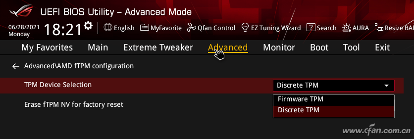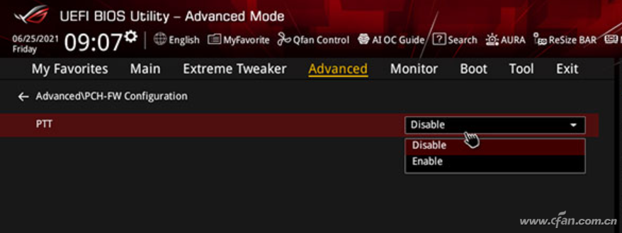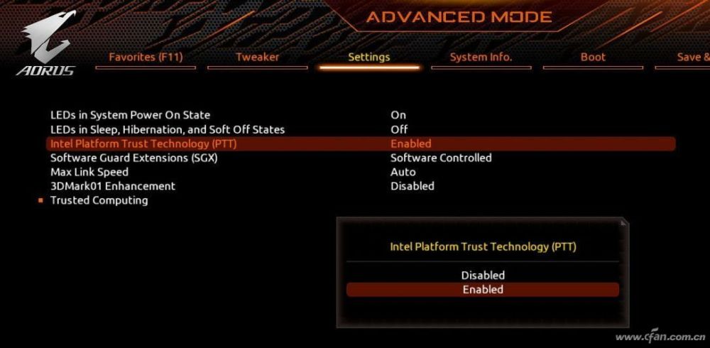 开机时按F2或者Del键进入BIOS,在菜单栏里选择Advanced Mode高级模式。之后就不同了,Intel平台找到PCH-FW Configuration页面,其中PTT(Platform Trust Technology的缩写)选项修改为Enable或Disable;AMD平台要找到AMD fTPM configuration选项,其中Firmware TPM为启动。