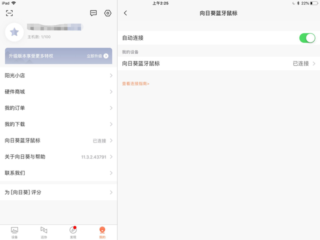 接下来再将鼠标与手机/平板连接,这里我使用的是iPad,具体操作为:开启鼠标电源;按住底部黄色模式键3~5秒,直至蓝色指示灯连续闪烁;打开iPad蓝牙搜索,找到名为Sunlogin MM110新设备进行配对;配对完成后,进入移动端的向日葵远程控制App,点击【我的】――【向日葵蓝牙鼠标】――开启【自动连接】,至此整个前置步骤就已经完成了。