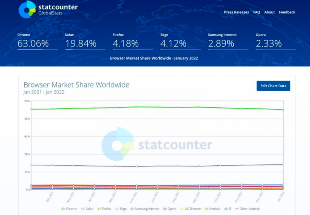 行动平台 Edge 同样有崛起趋势,2021 年初仍与三星浏览器、Firefox 市占相当,从去年 11 月开始逐渐拉开差距,2022 年 1 月以 4.12% 位居第三领先三星(2.89%)。不过借由 iPhone 在市场的强势表现,Safari 行动平台市占达到 19.84%,第二名的位置仍相当牢固。龙头则是 Chrome 达到 63.06%。