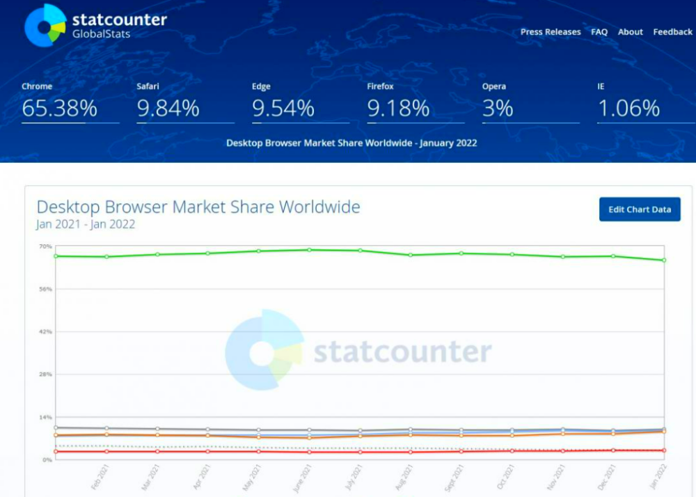 Edge 过去一年缓步成长,在 2021 年 1 月仍只有 7.81%,当时落后 Safari 约 3%,只排在第四名,从 2021 年 9 月开始逐步拉近差距,现在已超越 Fireforx(9.18%)名列第三,距离击败 Safari 仅剩一步之遥。
