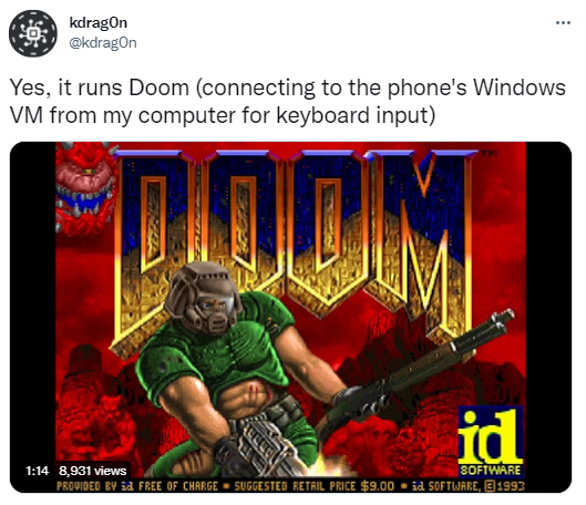 不仅如此,@kdrag0n 还成功通过 Pixel 6 的 Windows 虚拟机,连接到电脑上(为进行键盘输入),十分顺畅地玩起了 1993 年的老游戏《毁灭战士》。