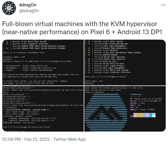 为证明其运行成功,@kdrag0n 在推特上发布了一则各种 Linux 发行版作为 VM 在 Pixel 6 上启动的视频,其中包括 Ubuntu 21.10、Arch Linux Arm、Void Linux 和 Alpine Linux,甚至还有一段在 Arch 上为 arm64 编译 Linux 5.17-rc3 allnoconfig 的录屏。