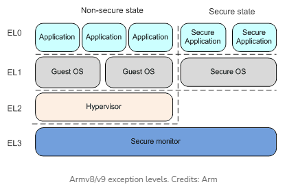 从上面这张 ARMv8/v9 异常模型中可以看出,虚拟机程序运行在 EL2 层,而在 ARM 命名法中,数字越大,特权级别越高,即 EL2 比行在 EL0、EL1 的代码权限更高。这也就意味着,许多闭源二进制文件的第三方代码的运行权限,比操作系统和内核还高。这显然是个安全隐患,因为在较高 EL 上运行的代码可访问低级别的所有寄存器。
