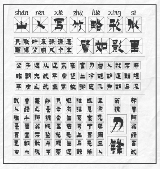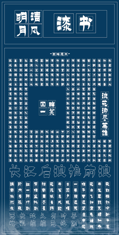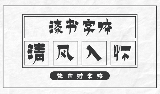 该字体定位为漆书,其实是楷、隶于一体的变体书法。以北魏楷书笔意书之,间夹隶书,字体方正,字态静穆古拙,看似字字断开,而其间笔意顾盼映带,整套字体给人以一种古朴生拙的气息。