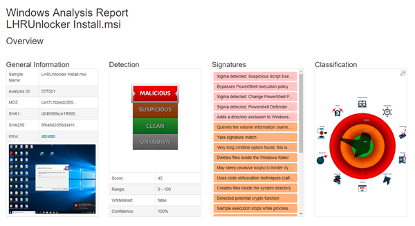 它的主执行文件LHRUnlocker Install.msi不但起不到破解算力的作用,还会感染Windows命令行服务程序powershell.exe并绕过其执行策略,添加目录屏蔽Windows Defender安全服务,以挂起模式添加进程(疑似注入代码),获取硬盘序列号等敏感信息,等等,并导致CPU占用率过高。