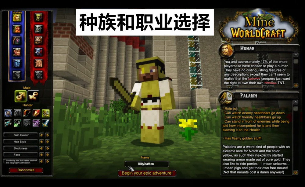 种族设定;玩家在进入Minecraft2是需要选择种族和职业,种族就包括了史蒂夫、僵尸、骷髅、苦力怕、末影人等等。