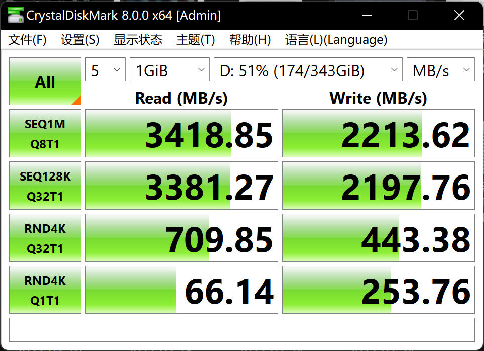 接下来我们也针对华为MateBook E的SSD和内存进行了专项测试。在测试硬盘读写性能的CrystalDiskMark 8.0测试中,华为MateBook E搭载的512 GB的NVMe SSD最高顺序读取速度为3418.46MB/s,最高顺序写入速度2213.62MB/s,而4K随机读写速度分别为66.14MB/s和253.76MB/s,在PCIe 3.0固态中性能表现优异。内存方面,华为MateBook E采用了16GB容量LPDDR4 SDRAM 3733MHz双通道内存,在AIDA64 Cache&Memory Benchmark的测试中,内存读取、写入、复制速度分别为56699 MB/s、58575 MB/s、56237 MB/s,延迟99.2ns,整体表现还是非常出色的,大容量高速内容有助于加快系统的响应速度。
