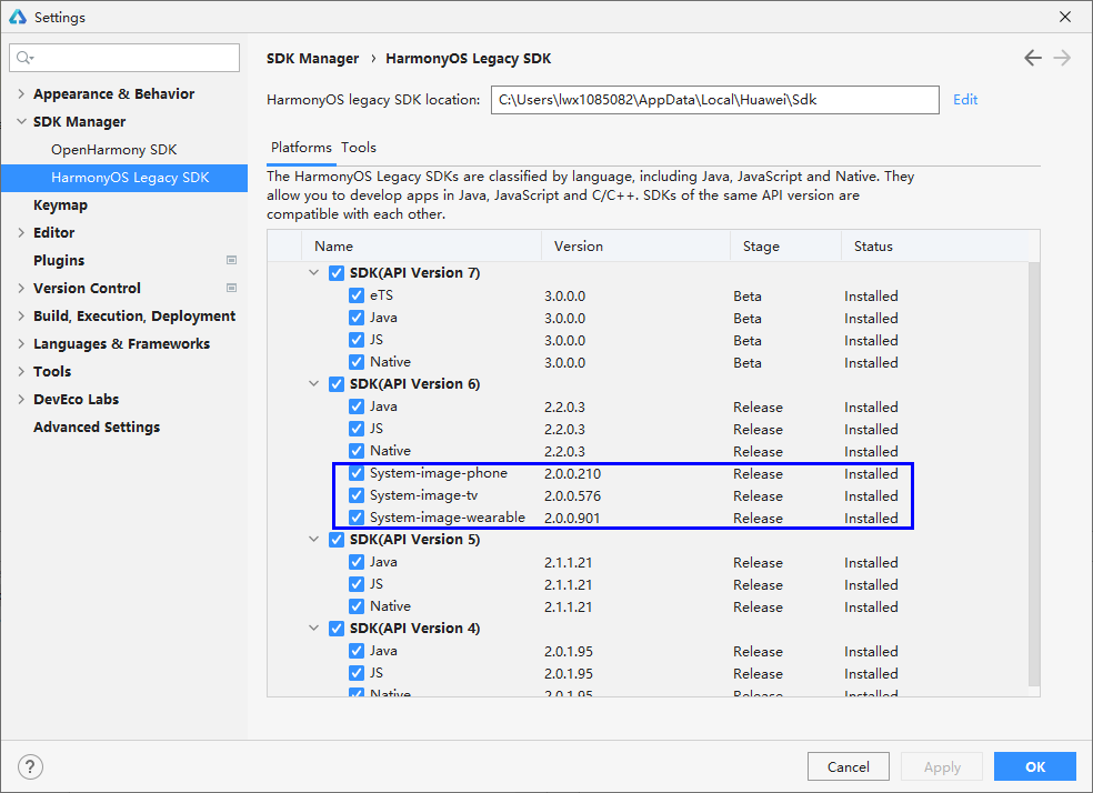 (2)如图 3 所示,在“SDK Manager> HarmonyOS Legacy SDK”页签,勾选“Platforms”下的镜像包。不同的的镜像包对应不同的设备类型,System-image-phone 镜像包对应手机,System-image-tv 镜像包对应智慧屏,System-image-wearable 镜像包对应智能手表。