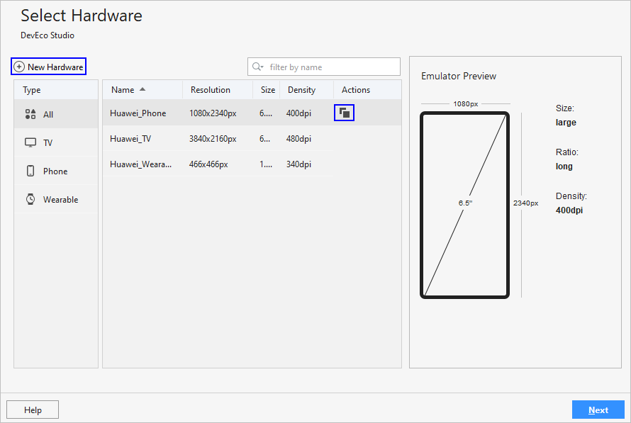 如图 4 所示,DevEco Studio 默认提供 Huawei_Phone、Huawei_TV 和 Huawei_Wearable 三个设备,分别对应手机、智慧屏和智能手表。针对华为设备的特征,DevEco Studio 对这三个设备预置了尺寸、分辨率等参数。