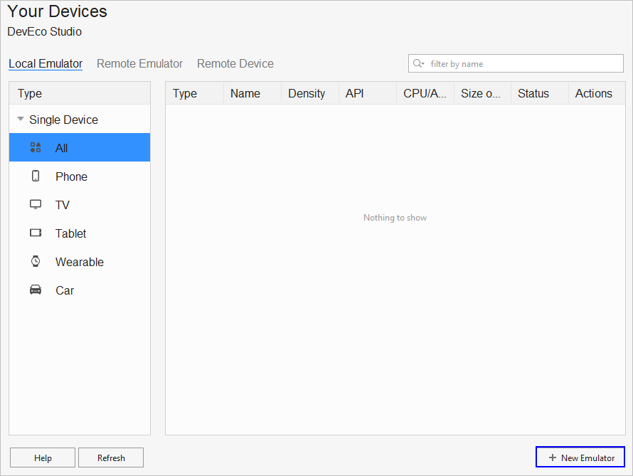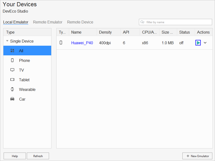(1)打开 DevEco Studio,选择“Tools> Device Manager”。如图 3 所示,在 Local Emulator 页签中,点击右下角的 New Emulator 按钮,开始创建本地模拟器。