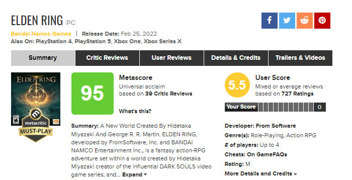 《艾尔登法环》PC版MTC用户评分:5.5分